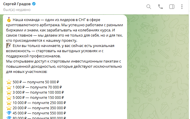 В проекте по криптовалюте Сергей Градов предлагает подписчикам разогнать счет за несколько часов в десятки раз. Работа ведется в Телеграмм канале Zona Дохода, который в настоящее время уже сменил название на Запуск Дохода ru. Отзывов о трейдере пока нет. В статье выясним, действительно ли можно заработать с Градовым или это очередная мошенническая схема.