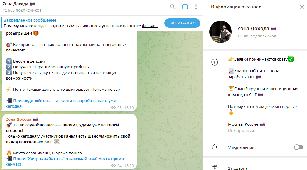 В сети пока нет отзывов о ТГ канале Zona Дохода, так как трейдер работает около месяца на мертвую аудиторию. Однако стоит отметить, что развод в подобных проектах осуществляется по хорошо известной схеме: