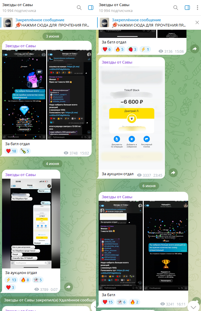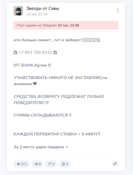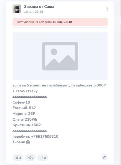 На вышеупомянутом сервисе со статистикой нам удалось увидеть и удаленные публикации с телеграмм-канала «Звезды От Савы». Оказалось, что автор действительно активно чистит свой блог. Так мы увидели, что кроме баттлов админ проводит и сомнительные аукционы.