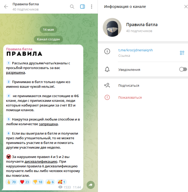 Правила самого участия в данном мероприятие автор как раз и указал в первой публикации на канале. Например, участникам батла можно делать рассылку и агитировать за себя голосование. А вот накручивать реакции полностью запрещено. Если участник стал победителем, две недели он больше не может принимать участие в этом состязании.