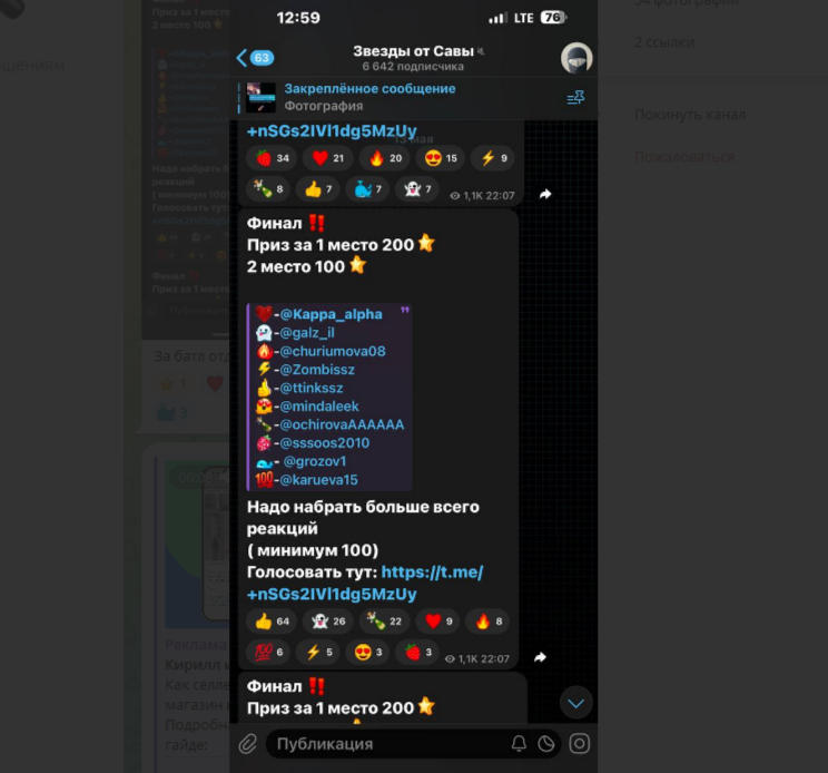 Под этими публикациями он отчитывается за что подарил подарок, например, за батл или аукцион. Вот только странно, что никаких объявлении о розыгрышах и о стратах аукциона здесь нет.Мы подробнее изучили имеющиеся публикации в тг-канале «Звезды От Савы» и увидели, что в блоге действительно были публикации с батлами. В его рамках блогер за 1 место обещал 200 звезд, а за второе – 100. Победитель баттла определяется только путем голосования. Но публикации, которая изображена на скриншоте, в группе нет. Видимо, автор подчищает свою страницу.