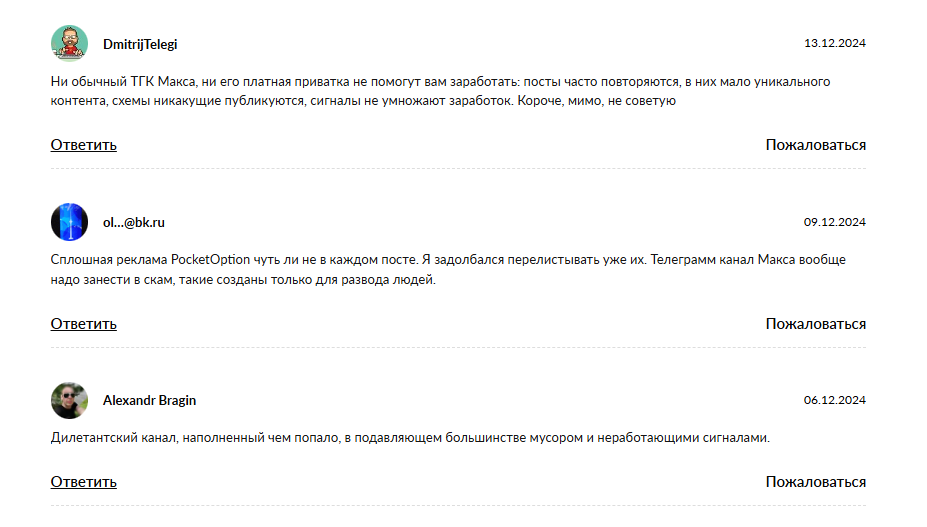 Отзывы пользователей о проекте MaxTrade на сторонних ресурсах исключительно негативные. Подписчики пишут, что ни в открытом, ни в закрытом канале полезной информации нет. Публикации часто повторяются, информация в основном одна и та же. Стратегии торговли, предложенные автором, по факту не работают, а сигналы не дают результата. Плюс пользователей раздражает постоянная реклама биржи PocketOptions.