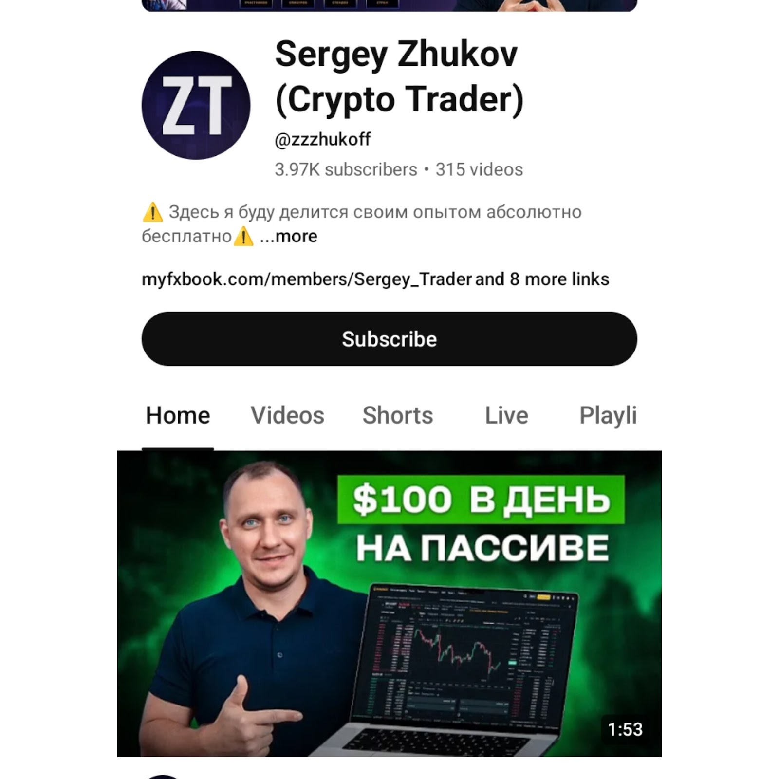 Трейдер Сергей Жуков ведет YouTube канал Sergey Zhukov Crypto Trader, к которому присоединилось 3.9k пользователей.