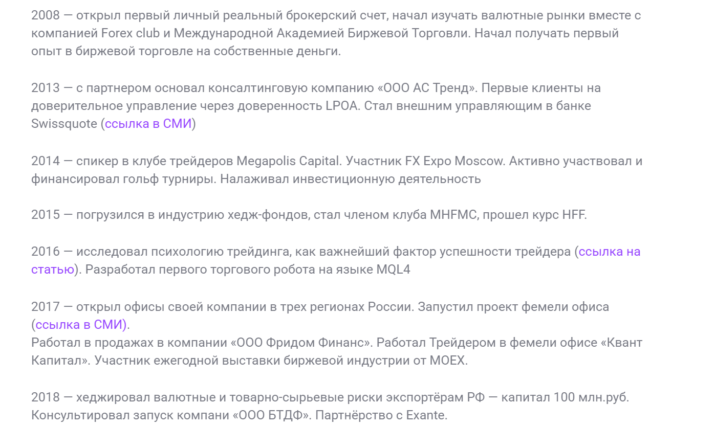 - 2019-2022 года. Был опыт работы трейдером в компании, основал свою проп-трейдинговую организацию. Совершил рекорд в области транслирования торговли;