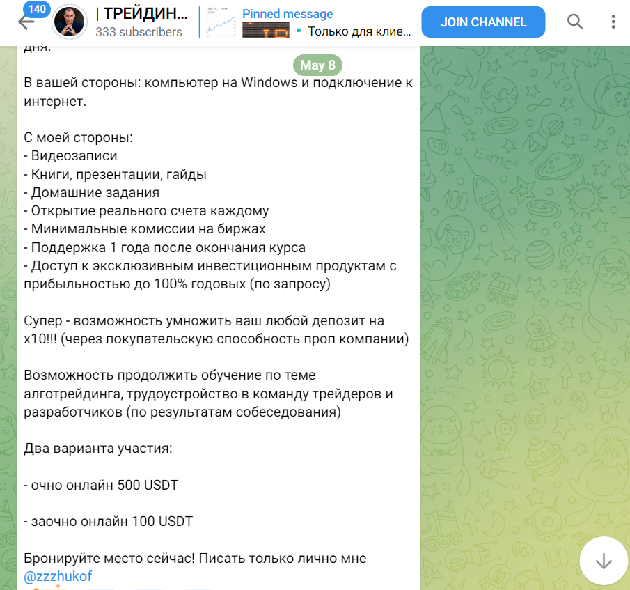 Трейдер Сергей Жуков продвигает консультации, о которых можно узнать с помощью бота Zzzhukoff go. Одно занятие оффлайн по торговле обойдется в 1 тыс. долларов. Если пользователь желает взять годовое менторство с целью выйти на значительный доход, то придется заплатить 10 тыс. долларов. Клиенты смогут получить доступ к чату с другими пользователями и попасть в платное сообщество. По вопросам партнерства нужно обращаться на почту info zzzhukoff ru. Стоит отметить, что документов на обучение нет, как и гарантий возврата денег.