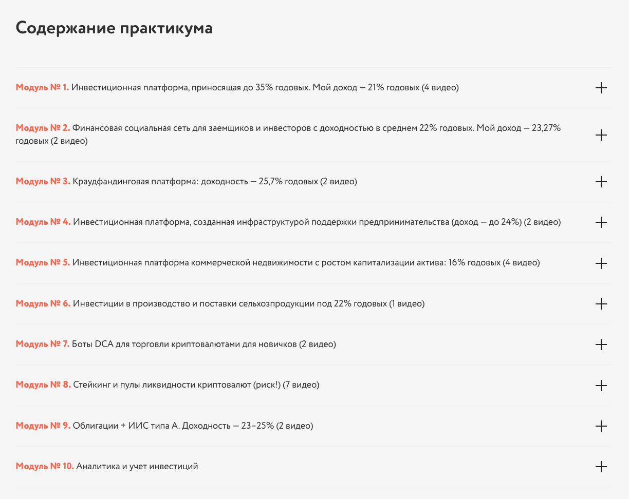 На сайте размещена программа курса. Судя по этому описанию, покупателю дают материалы, которые содержат базовую информацию об инвестировании.