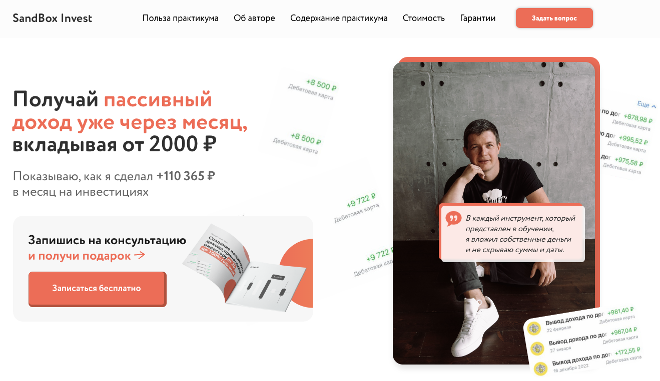 Свои услуги Кравцов Александр презентует на сайте sandbox invest ru. На нем он предлагает включаться в практикуем его собственной разработки.
