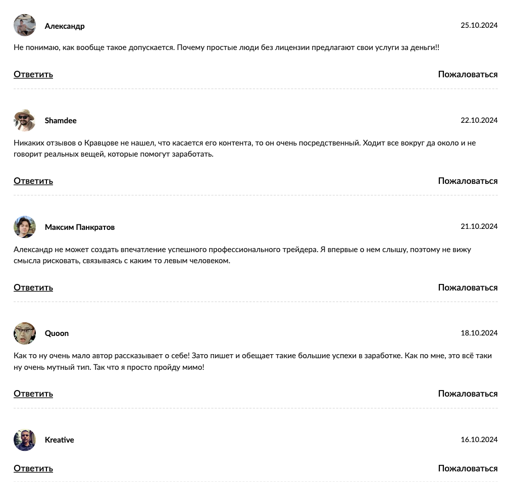 Мы рекомендуем с настороженностью относиться к Александру Кравцову. Если есть цель найти наставника по инвестированию, лучше внимательно изучить рынок. На нем есть люди, которые вызывают больше доверия.