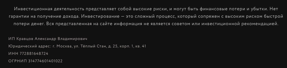 Для реализации коммерческой деятельности Кравцов использует ИП. Данные компании приведены на сайте инвестора.