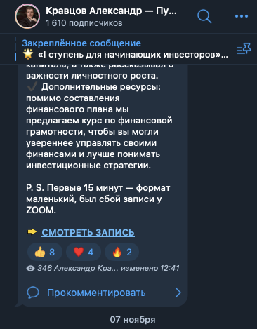 На телеграмм-канал «Кравцов Александр Путь к 300 000 руб в месяц пассивного дохода», kravtsovinvest, на 14 ноября 2024-го года, подписано около 1,6 тысяч пользователей.