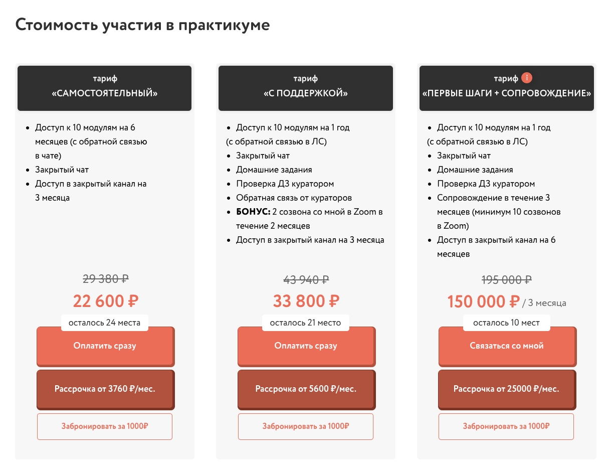 За курс, который предполагает проверку домашних заданий, предлагают заплатить 33,8 тысяч. За 150 тысяч рублей клиент получает трехмесячное сопровождение и 10 созвонов в Zoom.