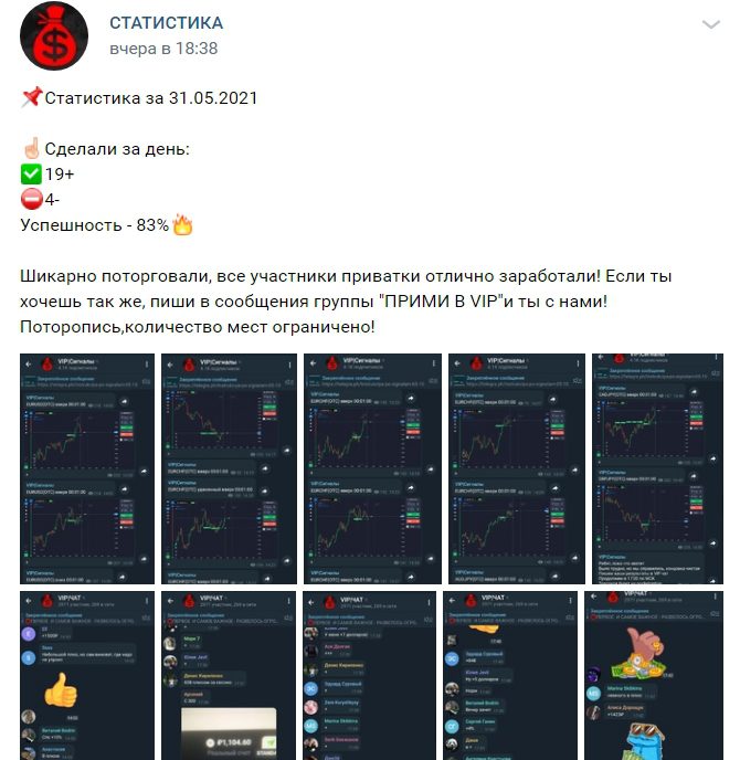 В общей ленте отсутствуют бесплатные сигналы, ежедневно публикуется лишь статистика закрытого чата. В нем трейдер не гарантирует проходимость выше 90% по сигналам, но обещает постоянный заработок от 100 000 рублей.
