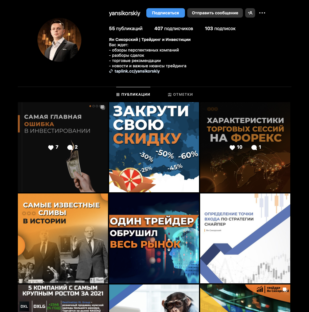 В Instagram у трейдера около 400 подписчиков. Уровень взаимодействия с контентом: до 10 лайков и 1-2 комментария на публикацию.