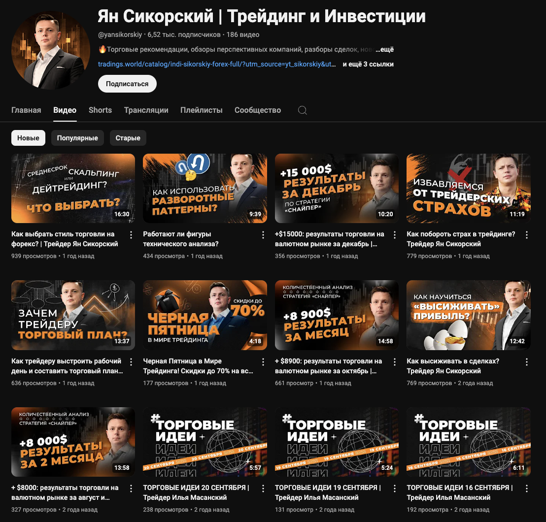 На ютуб-канале «Ян Сикорский Трейдинг и Инвестиции» активности тоже нет на протяжении года. До этого автор тоже не проявлял большого рвения. Он выкладывал на канал новый контент с периодичностью раз в 1-2 месяца.
