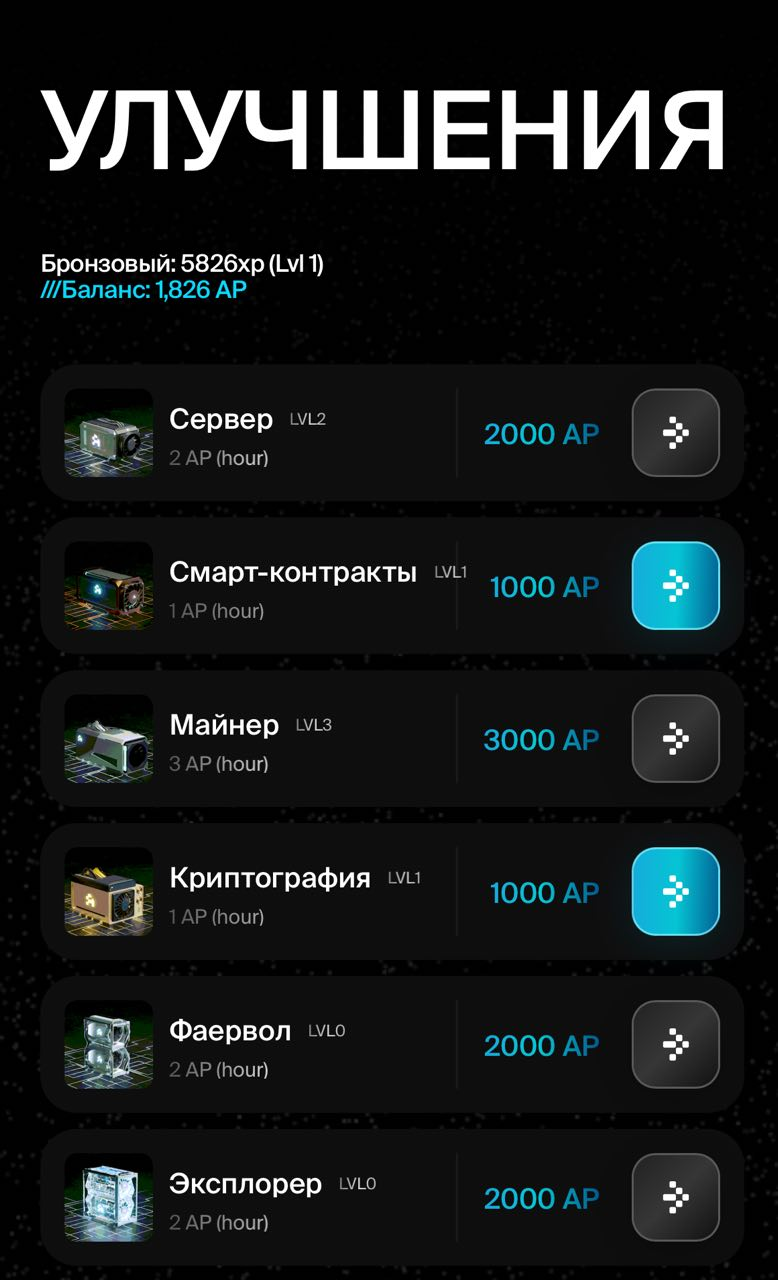 В игре также предусмотрена система апгрейдов. Чем больше апгрейдов покупает пользователь, тем больше АР он сможет получать каждые четыре часа. Бонусы в AtletaTAP не предусмотрены.