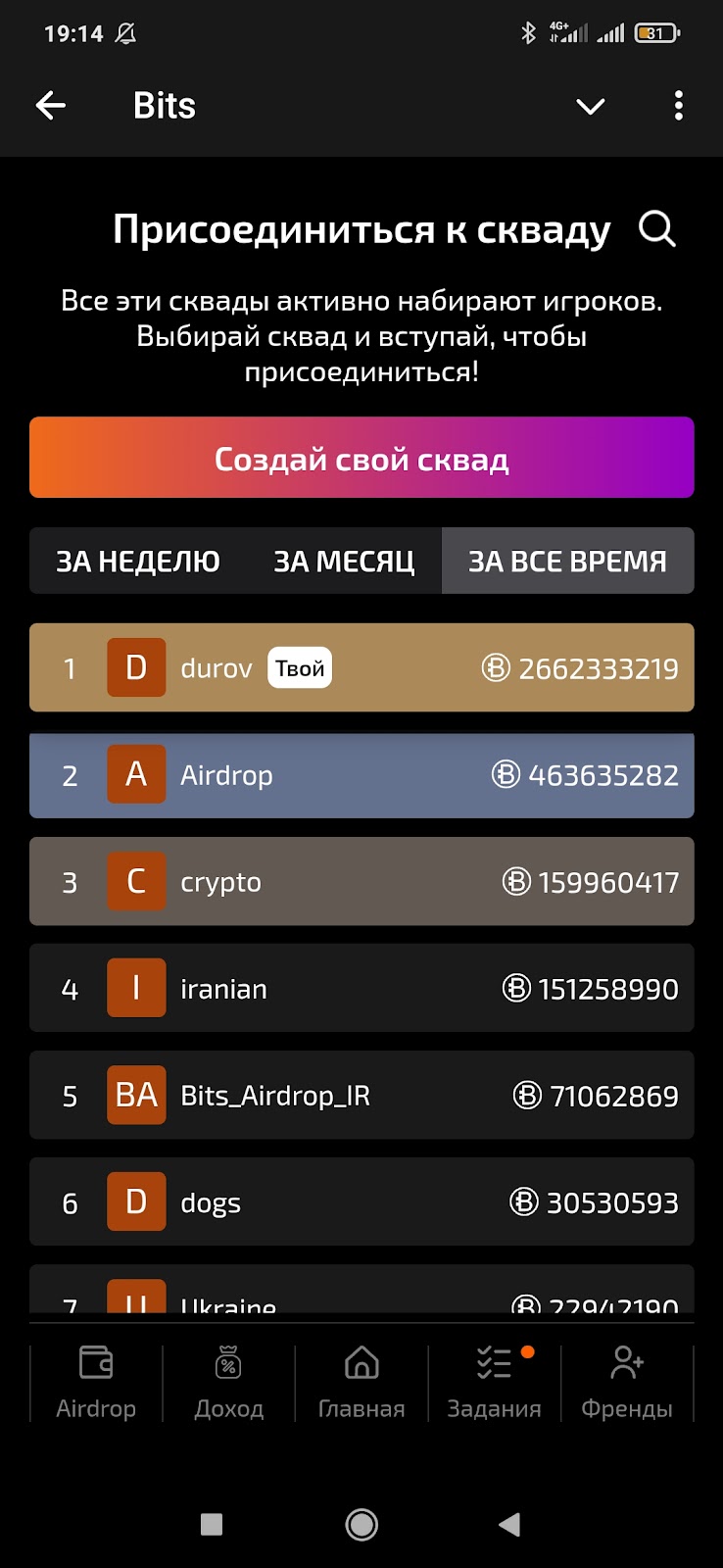 Игра Bits в Телеграм имеет соревнование сквадов, можно создать свой или выбрать существующий. Пока нет информации, что дает вступление в сквад, но в других тапалках командная игра обычно является мультипликатором при подсчете дропа. Возможно, нахождение в скваде из топа даст повышенный аирдроп Bits.
