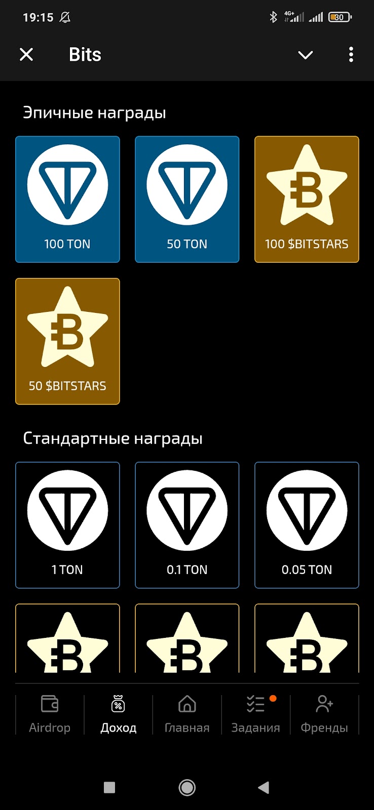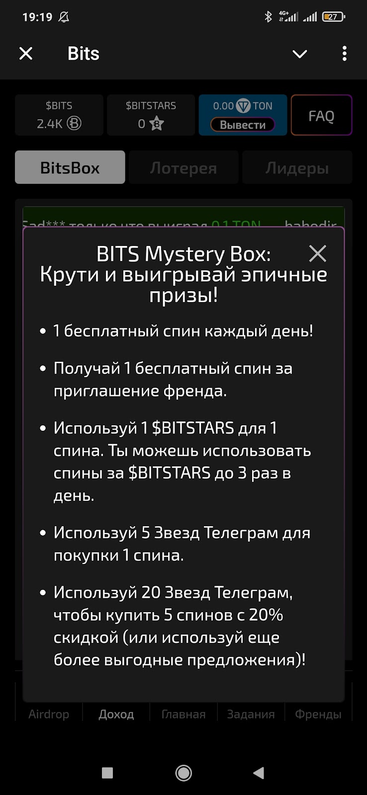 Раздел доход в BitsTonboxBot — коробка с призами, которую можно открывать каждые 8 часов.Из нее могут упасть эпичные награды — 50 и 100 Тон, 50 и 100 BitsStars. А также обычные призы в виде токенов Bits.