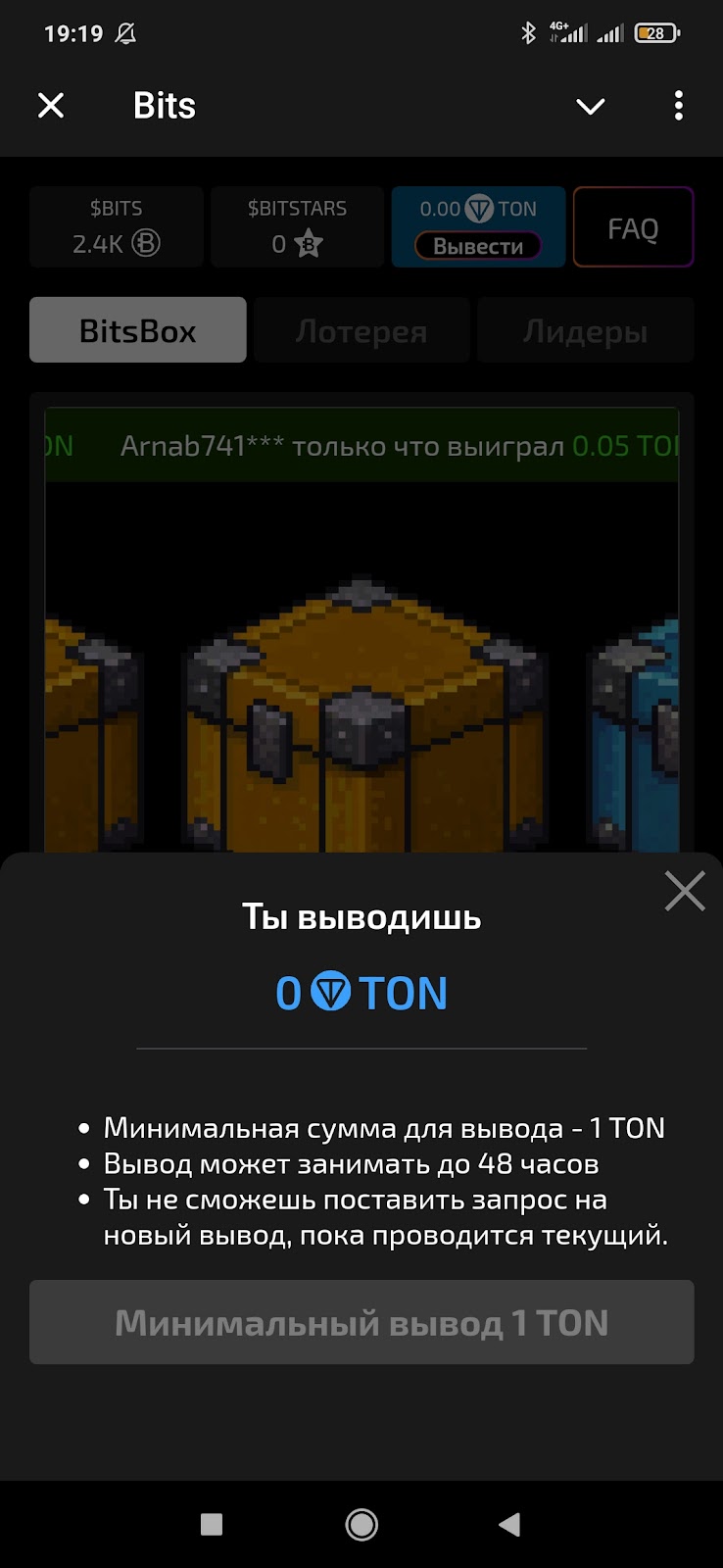 В Телеграм Bits открыт вывод полученных в коробках Тон, условия следующие: