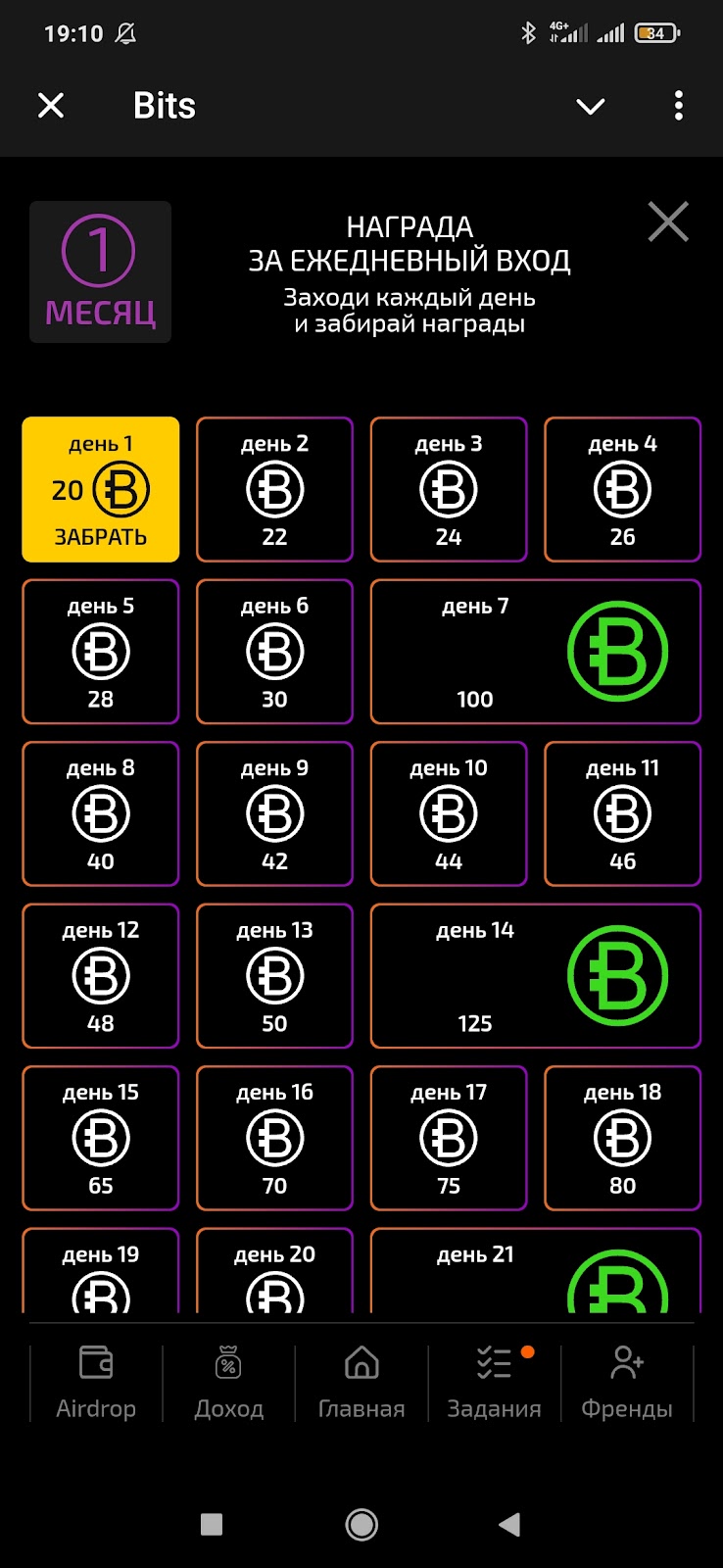 За посещение игры Телеграмм Bits без пропусков вознаграждение прогрессивное. Как видно на скриншоте, пользователям дается очень мало Bits, из чего можно сделать вывод, что эмиссия токена будет исчисляться не миллиардами.