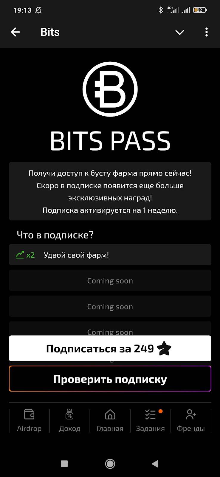 Bits Pass можно купить за Телеграмм Звезды, стоимость 249 старс. Буст действует 7 дней и удваивает фарм.