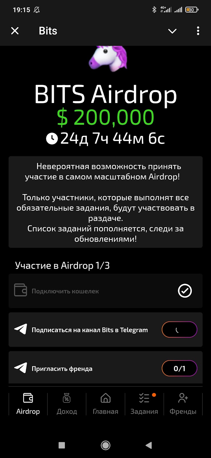 Задания в Bits tg — стандартные подписки на социальные сети и партнерские проекты. Также есть пассивный майнинг, перезапускать который нужно каждые три часа.