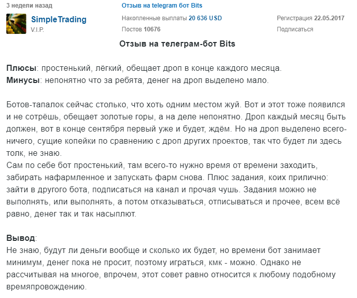 О перспективах игры Bits говорить сложно. С одной стороны большое комьюнити, популярность на форумах и возможность получать регулярный дроп. С другой стороны — полное отсутствие токеномики, анонимная команда. В Телеграмм Bits community около 10 млн пользователей, чата нет, довольно низкая активностей подписчиков. Но большая часть отзывов о Bits в Телеграмме положительная. Редакция не рекомендует инвестировать в подобные тапалки, так как нет гарантий возврата вложенных средств и заработка.