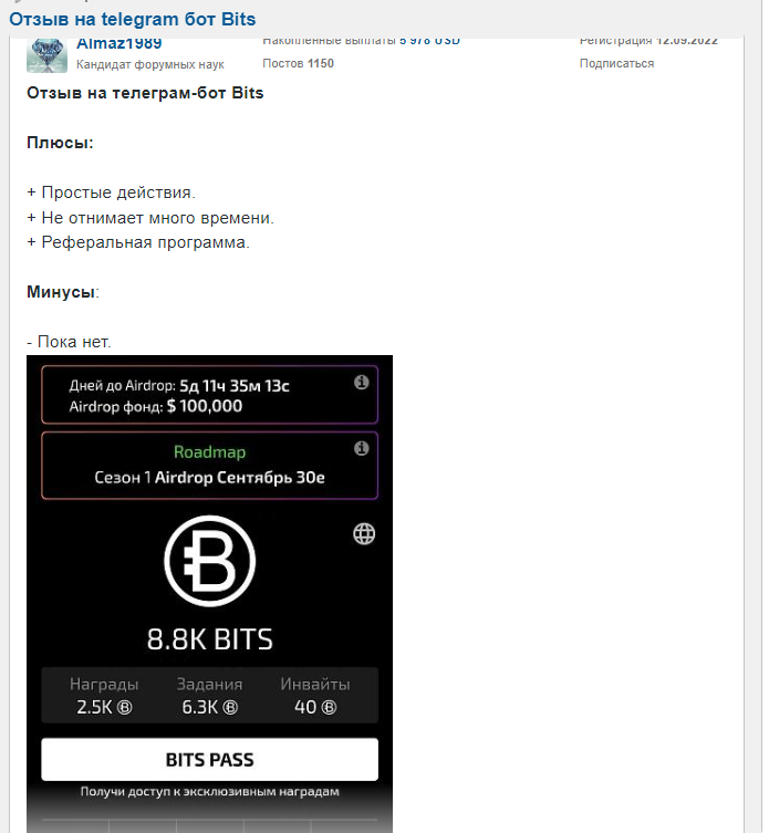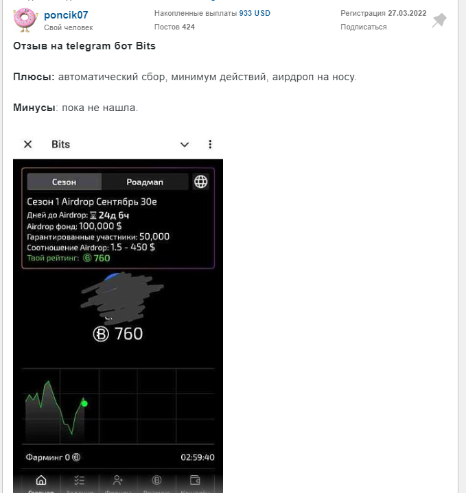 В сети можно найти как положительные, так и негативные отзывы о Bits. Минусами называют небольшую сумму дропа и размытые условия для участия в раздаче. Также есть проблемы с выполнением задач для аирдропа, реферальные подписчики засчитываются для обычных тасков, но не идут в зачет в разделе аирдроп. Плюсами в отзывах о Телеграм Bits называют минимальное количество затрачиваемого на игру времени и возможность заработка реальных токенов Тон. Своими впечатлениями о проекте вы можете поделиться под обзором Bits.