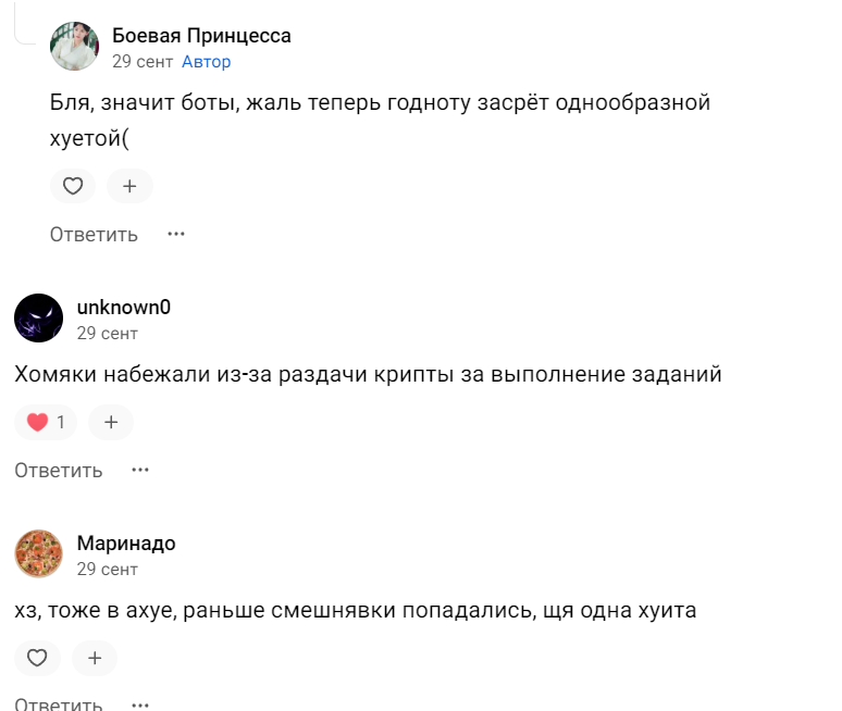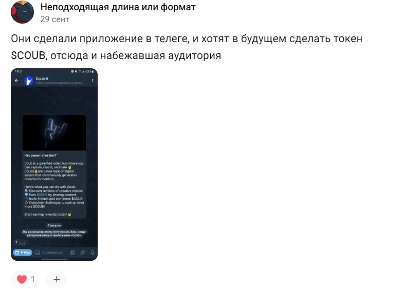 В сети отзывы о старом проекте Coub положительные, пользователям нравился камерный сайт с роликами, в которых можно было найти интересные видео. Однако после перехода платформы в Телеграмм появилось очень много так называемого мусорного контента, что негативно отражается на репутации проекта у старых пользователей. С другой стороны в Coub привлекли много новой аудитории, которая активно фармит токены в ожидании аирдропа и листинга Коуб.