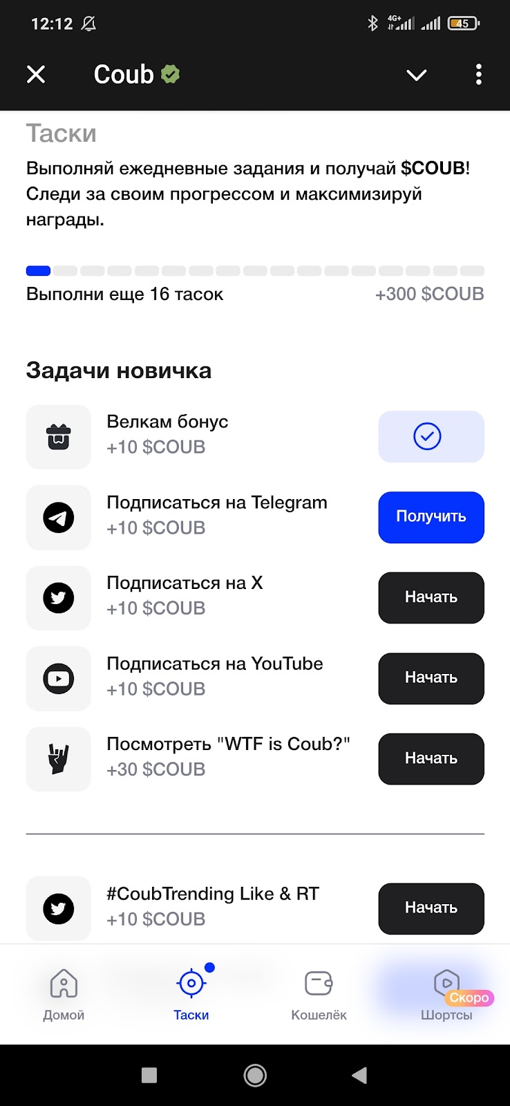 В Coub бот всего 4 раздела. В тасках всего 17 заданий, среди которых подписка на социальные сети, просмотр контента, лайки под видео. Бонус за выполнение всех квестов равен 300 Coub crypto.