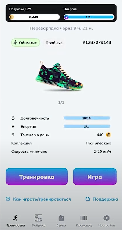 - Фабрика: онлайн магазин виртуальных кроссовок за токены Ezzy, здесь же при регистрации вы можете выбрать любые бутсы для использования в пробной версии. В течение 10 дней вы можете зарабатывать с ними, получать прибыль, однако она будет заморожена до совершения депозита на сумму стоимости кроссовок.