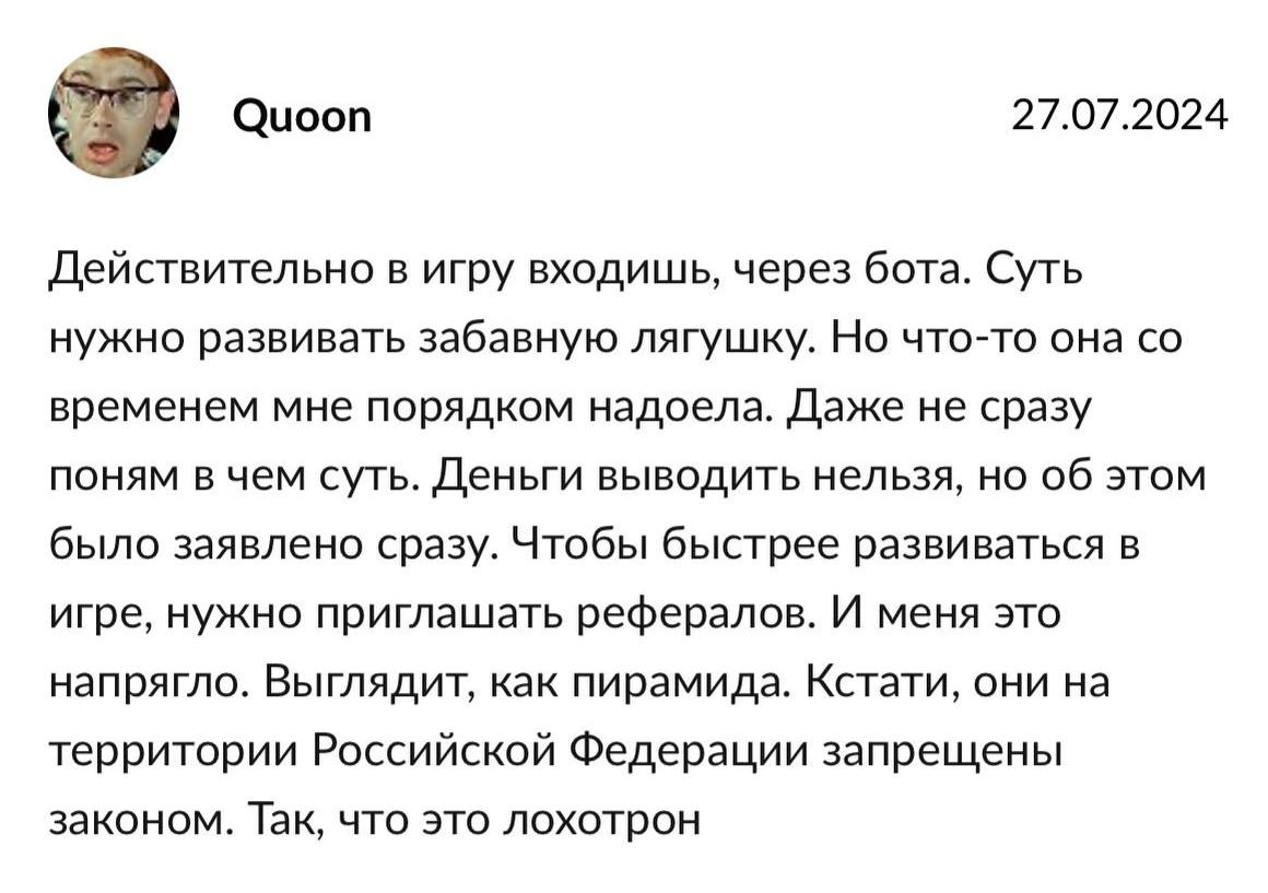 В негативных отзывах на FrogFarm можно увидеть жалобы на невозможность вывода средств в фиат до аирдропа. Некоторых пользователей смущает необходимость вкладывать реальные средства, а также то, что без активного вовлечения рефералов сильно не обогатишься на Frog Farm Crypto.