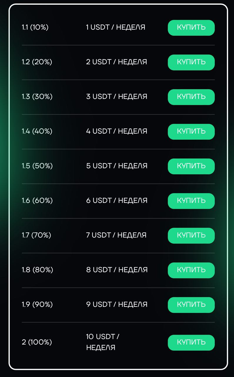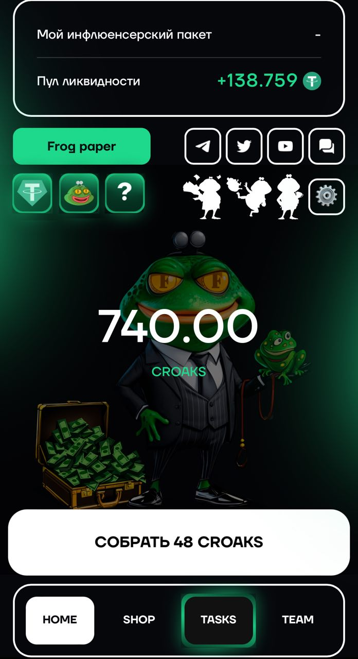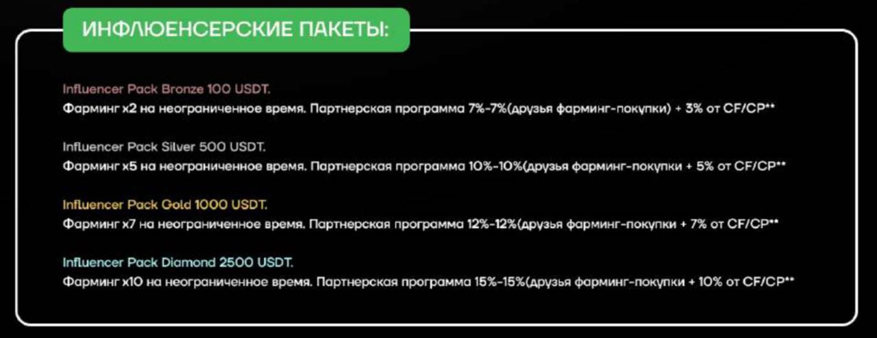 Уникальным способом монетизации проекта стал так называемый инфлюенсерский пакет. Он также бывает нескольких видов. При его покупке у вас бессрочно повышается в несколько раз скорость фарминга, процент с транзакций и фарма рефералов, а также приведенных ими игроков в FrogFarmBot. Чем больше вы заплатили за этот пакет — тем больше процент повышения. Самый дешевый пакет будет стоит сотню USTD, а самый дорогой — 2500.