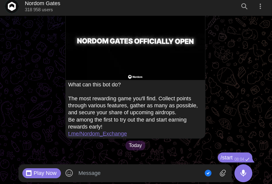 В тапалке Nordom Gates предусмотрены стандартные задачи, как, например, выполнение внутриигровых квестов, привлечение партнеров в игру. Также пользователи заработают токены на ежедневном заходе. Но чтобы получить ко всему этому доступ, необходимо сделать запуск бота — благо на сайте регистрироваться не нужно. Для работы с bot необходимо прописать команду /start или же нажать кнопку Play Now.