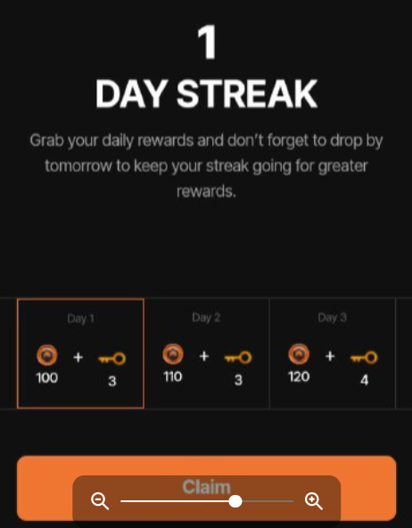 После запуска бот сразу предоставит возможность забрать награды. Чем чаще пользователь заходит в игру, тем выше последующие вознаграждения. За первый день в тапалке Nordom Gates начисляются 100 монет и 3 ключа и чтобы из забрать, надо кликнуть на кнопку Claim.
