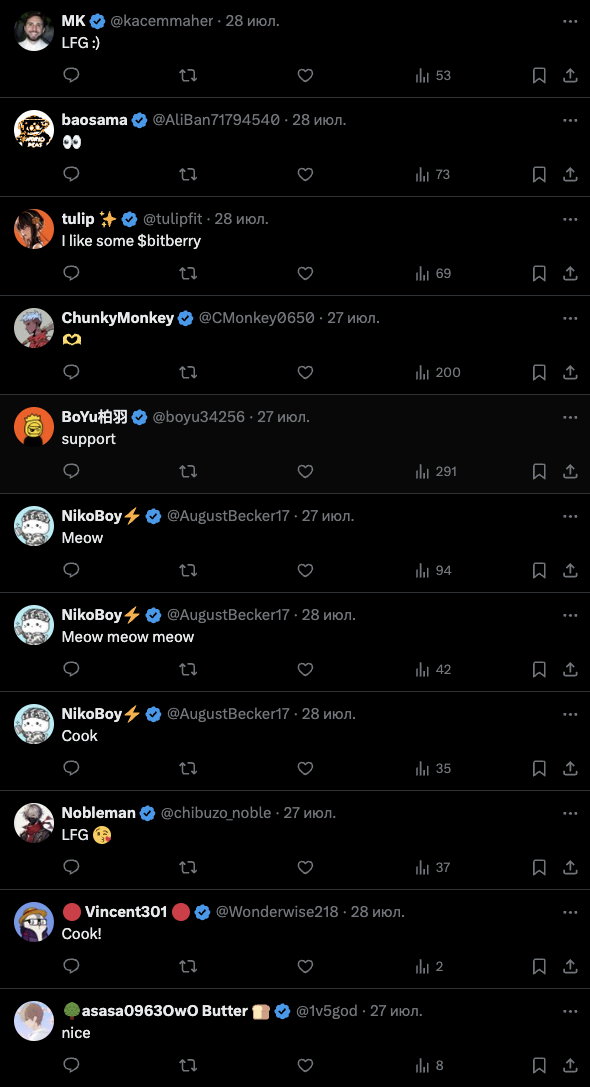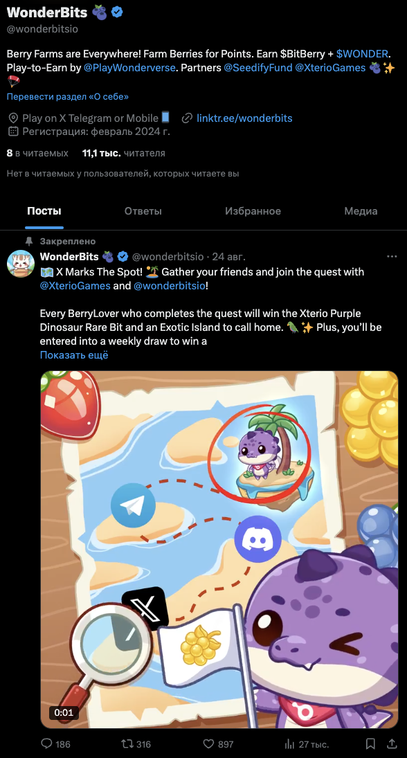 Основной аккаунт проекта «ВондерБитс» – это страница wonderbitsio в Twitter. На нее, на 10 октября 2024-го года, подписано около 11,1 тысячи читателей. При этом, публикации за более чем месяц своего нахождения в ленте получают около 30 тысяч показов.