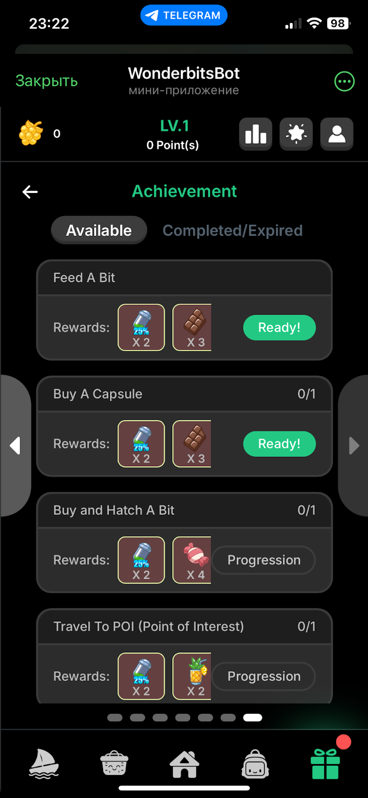 Достижения позволяют заработать капсулы и корм для питомцев. Они, в свою очередь, необходимы для развития, а, следовательно, увеличения заработка.По ходу игры пользователь может столкнуться с дефицитом различных предметов. Чтобы его преодолеть, следует перейти в раздел Rewards и пролистнуть один раз в право. В результате отобразится список заданий. За их выполнение будет подарено определенное количество айтемов. Например, за подписку на официальный твиттер-аккаунт создателей приложения дается 20 ягод.