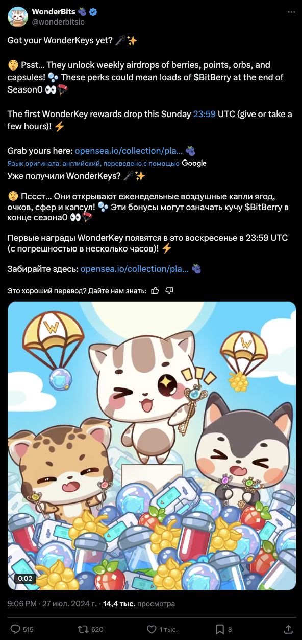 Соответствующий пост был выложен еще 27 июля 2024-го года. Однако на 10 октября дропа так и не произошло. Поэтому никто из участников пока не смог получить свой заработок из приложения Wonder Bits.