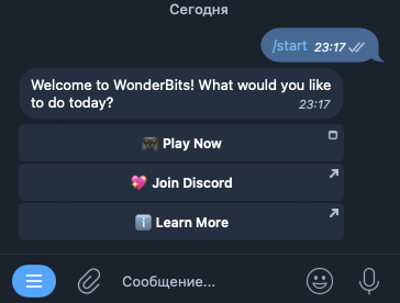 Чтобы начать играть, нужно зайти в телеграм-бот Wonderbits Vercel App, wonderbitsbot. После того как он будет активирован и в него поступит приветственное сообщение, потребуется нажать на кнопку Play Now.